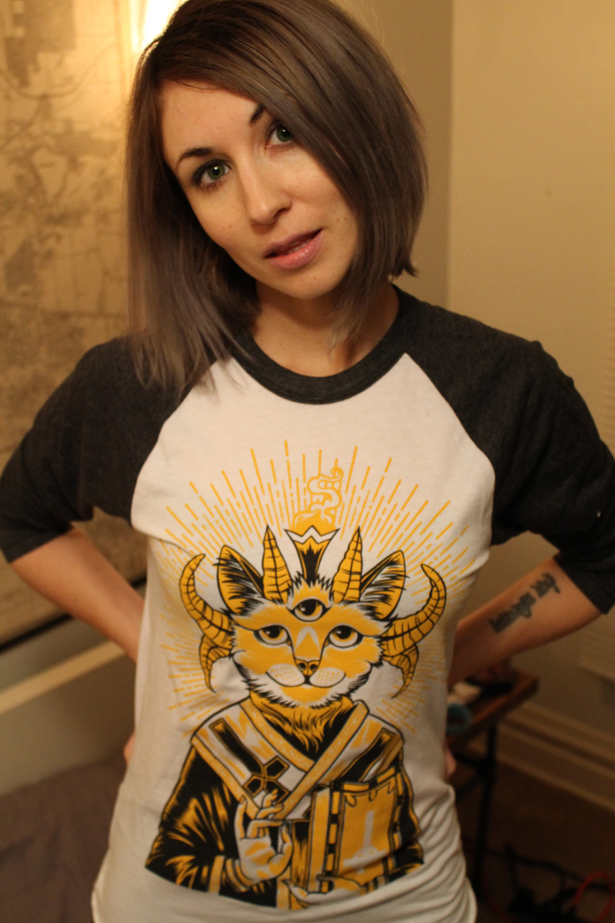 illustration of a baphomet demon cat in the style of greek orthodox saint iconography on a raglan baseball tee style shirt.