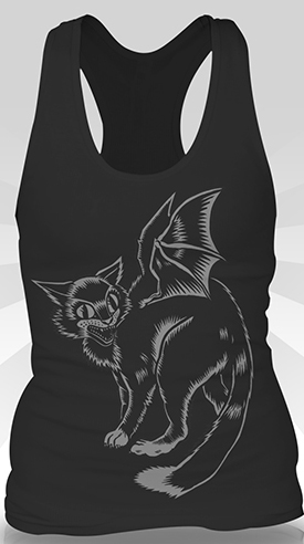 soft vintage print on triblend black racerback tanks featuring a bat cat