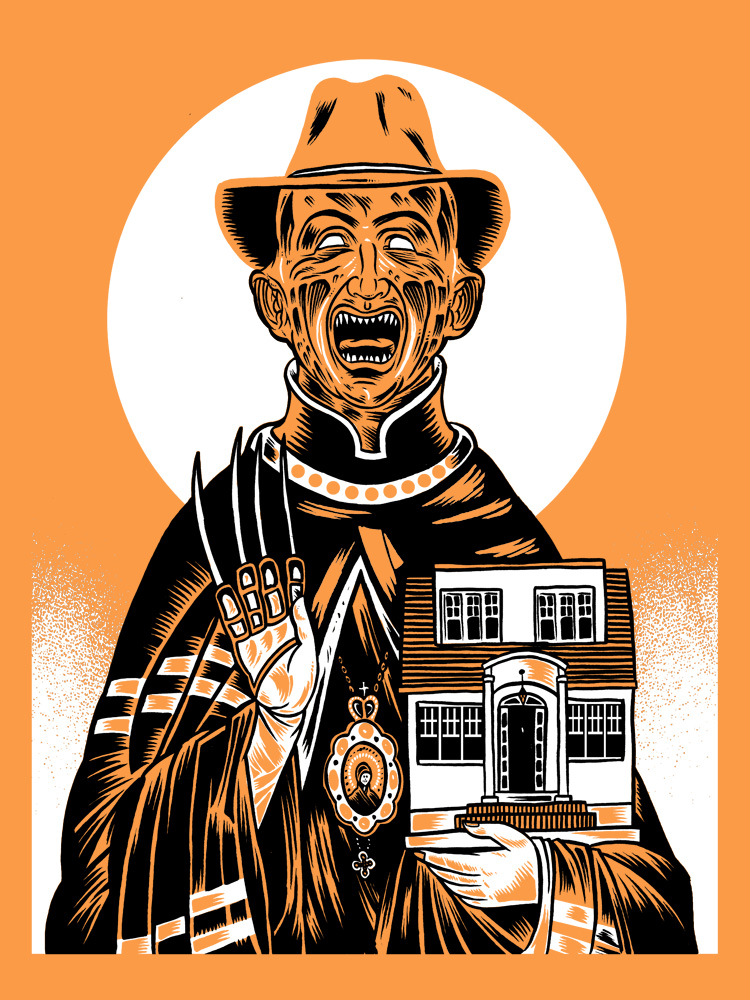 st. Krueger - patron saint of nightmares. 9x12 2 color screen print depicting freddy from the nightmare on elm street series in the style of orthodox saint iconography.
