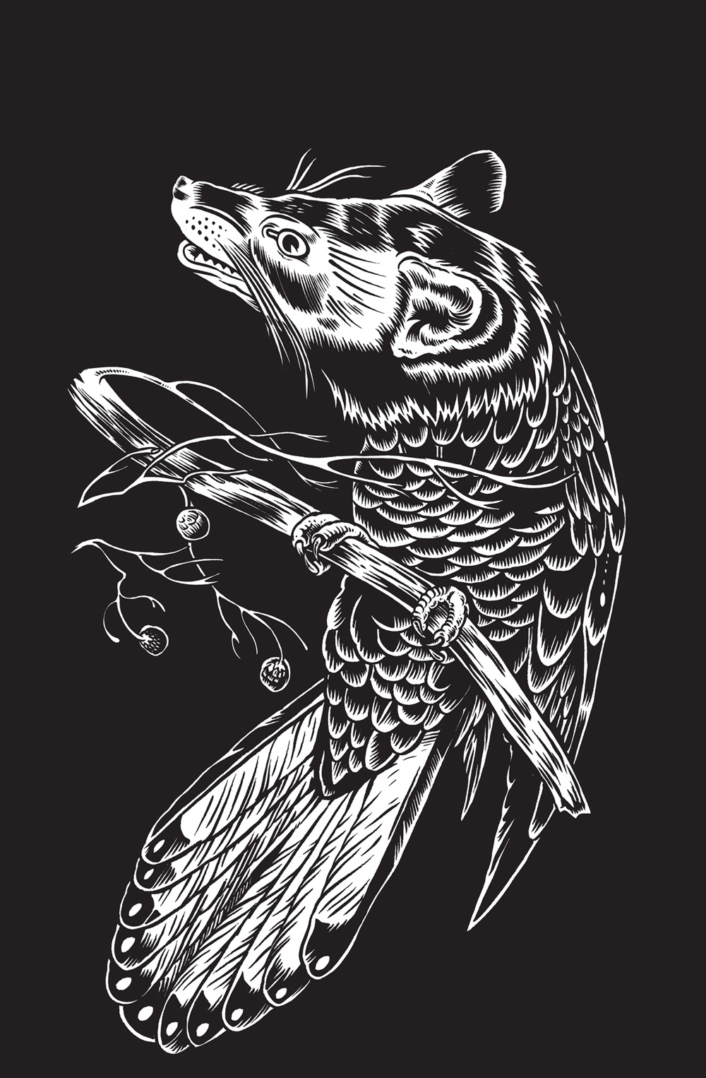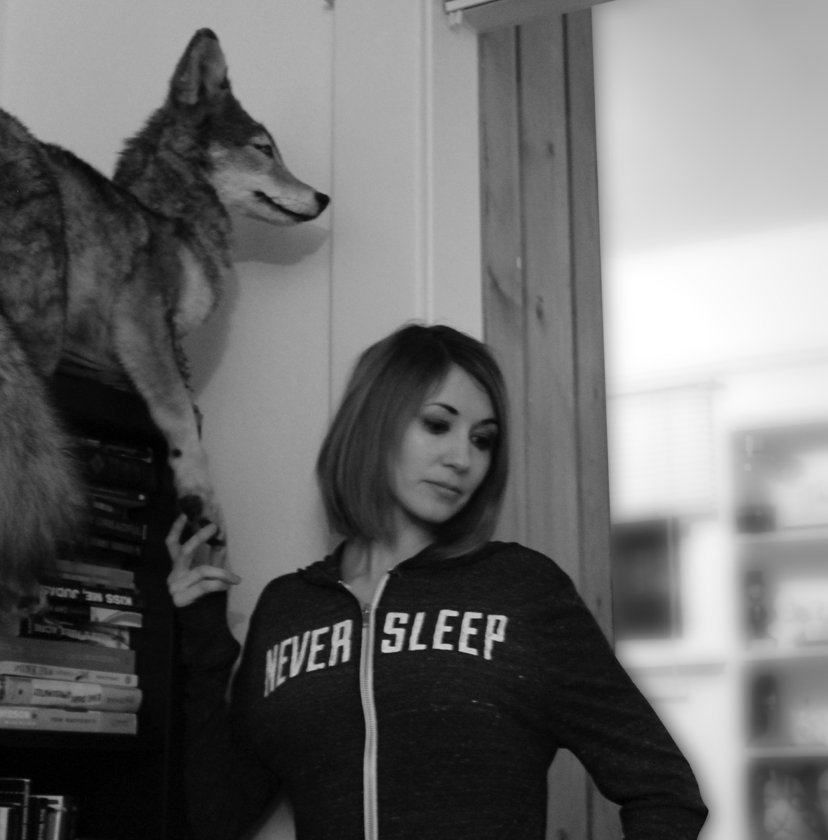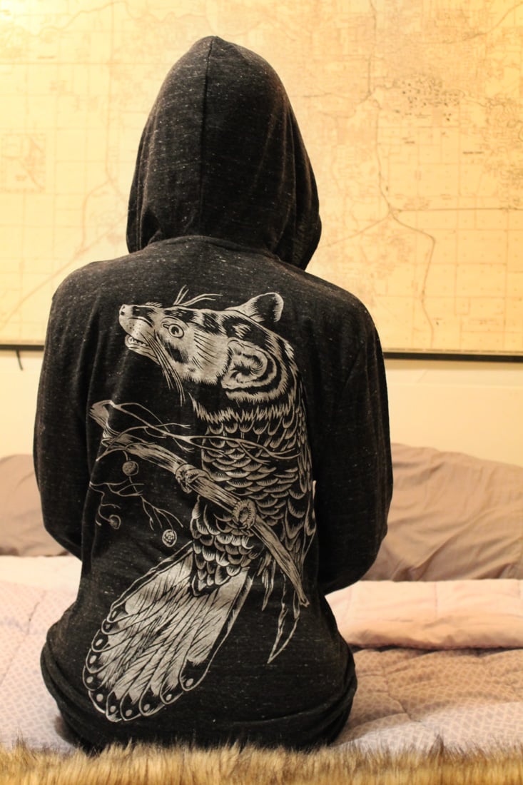 Super soft and comfortable eco-friendly american made heather black zip up hoodies with "NEVER SLEEP" on the front and a wolf-bird hybrid creature on the back.