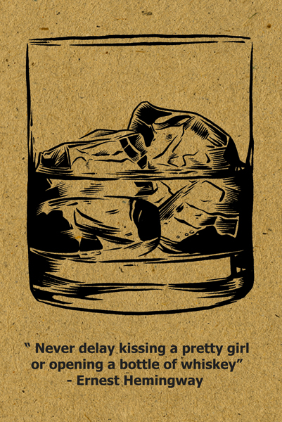 4 x 6 screen printed postcard featuring an illustration of whiskey and a whiskey related quote by Ernest Hemmingway