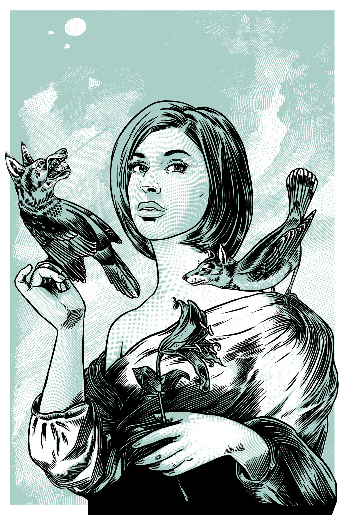 blue girl with wolf birds