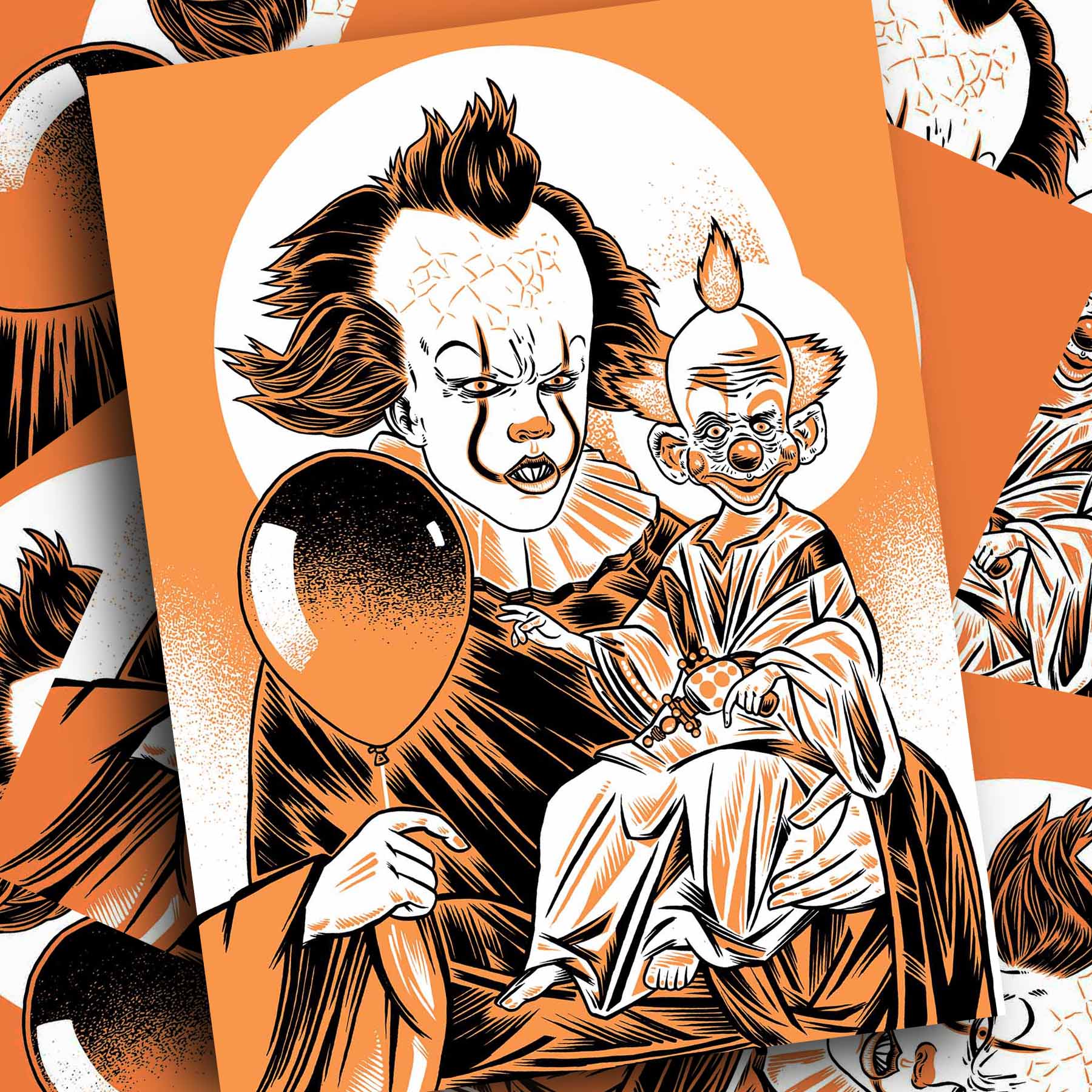 9x12 two color screenprint on orange paper featuring saint pennywise, the patron saint of fear. also featured is tiny, from killer klowns from outer space.
