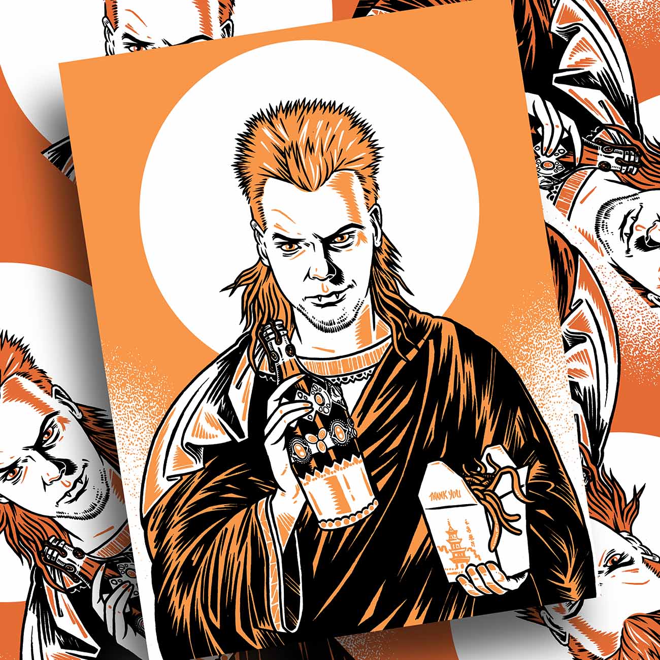 9x12 two color screen print on orange paper depicting saint iconography of david, from lost boys. "Now you know what we are, now you know what you are. You'll never grow old, Michael, and you'll never die."