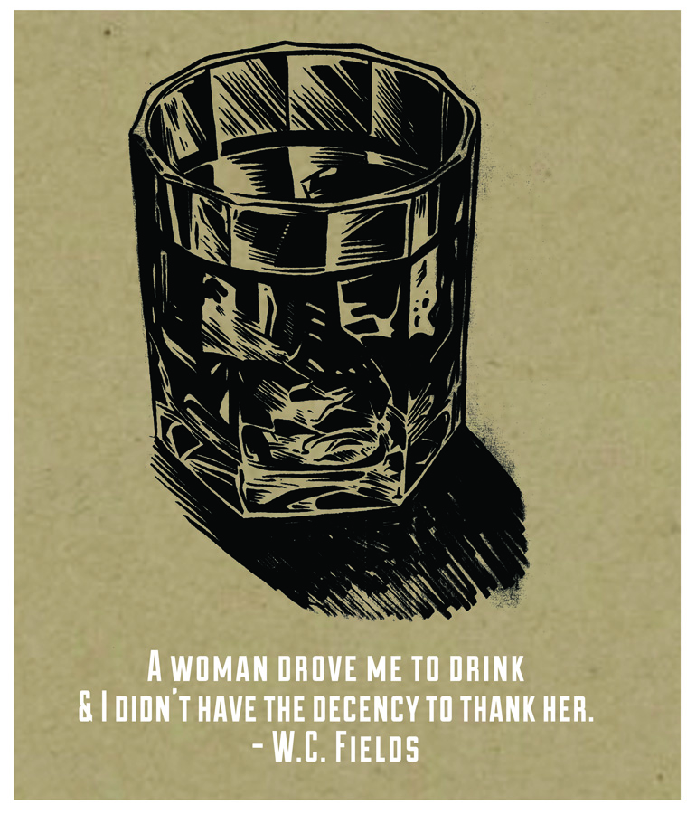a set of five 5 x 6 two color screenprints featuring illustrations of whiskey and famous quotes about whiskey. perfect for any home bar.